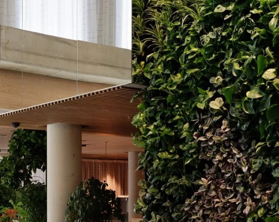 Interiøret er preget av rene linjer, naturlige overflater og dempet belysning. Det er lagt vekt på å skape et sanselig og rolig miljø med grønne vekster og organiske former. Hotellet har materialkvaliteter som gir en taktilitet og varme og som står seg over tid. Med eikevinduer- og dører, sementfliser og glasspartier med slanke stålprofiler.