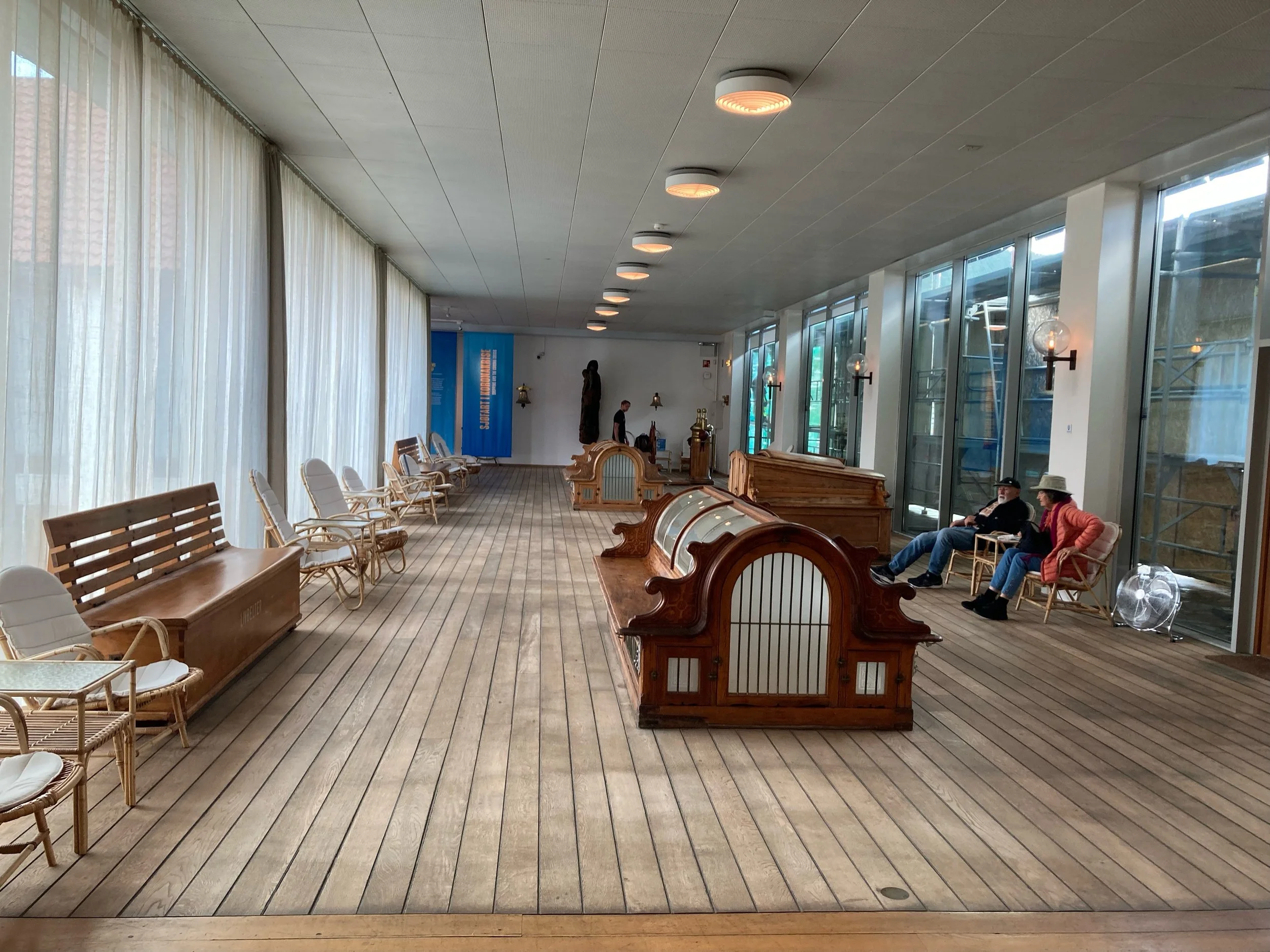 “Et værelse som ikke er vakkert når det er tomt, kan aldri bli det. Og et godt værelse kan aldri bli så vakkert som når det er tomt.” Slik lyder åpningslinjene i Torgrim Eggens “arkitektroman”, Pynt. Sjøfartsmuseets utstillingssaler ville vært vakre selv om de var tømt for museumsgjenstander. Den sakrale ro man opplever her, er verdt inngangsbilletten i seg selv. Det er en effekt som dels skapes av rommenes gode materialer, enkelhet og rene proporsjoner, men kanskje aller mest av den store lysgården med vannspeilet i midten. Liksom en klostergård er atriet en lukket, ordnet og kunstig sfære – et uvirkelighetens sted, avskåret fra den traurige ytre virkelighet. Den danner en konstruert og perfekt utsikt, som består kun av lys og orden. Det er en vertikal sjakt som henter ned enorme mengder lys og sol direkte fra himmelen, for så å spre det indirekte utover de omkringliggende salene der det får flyte utover, og der museumsgjestene kanskje bare ubevisst fornemmer dets eteriske, milde og saliggjørende tilstedeværelse.