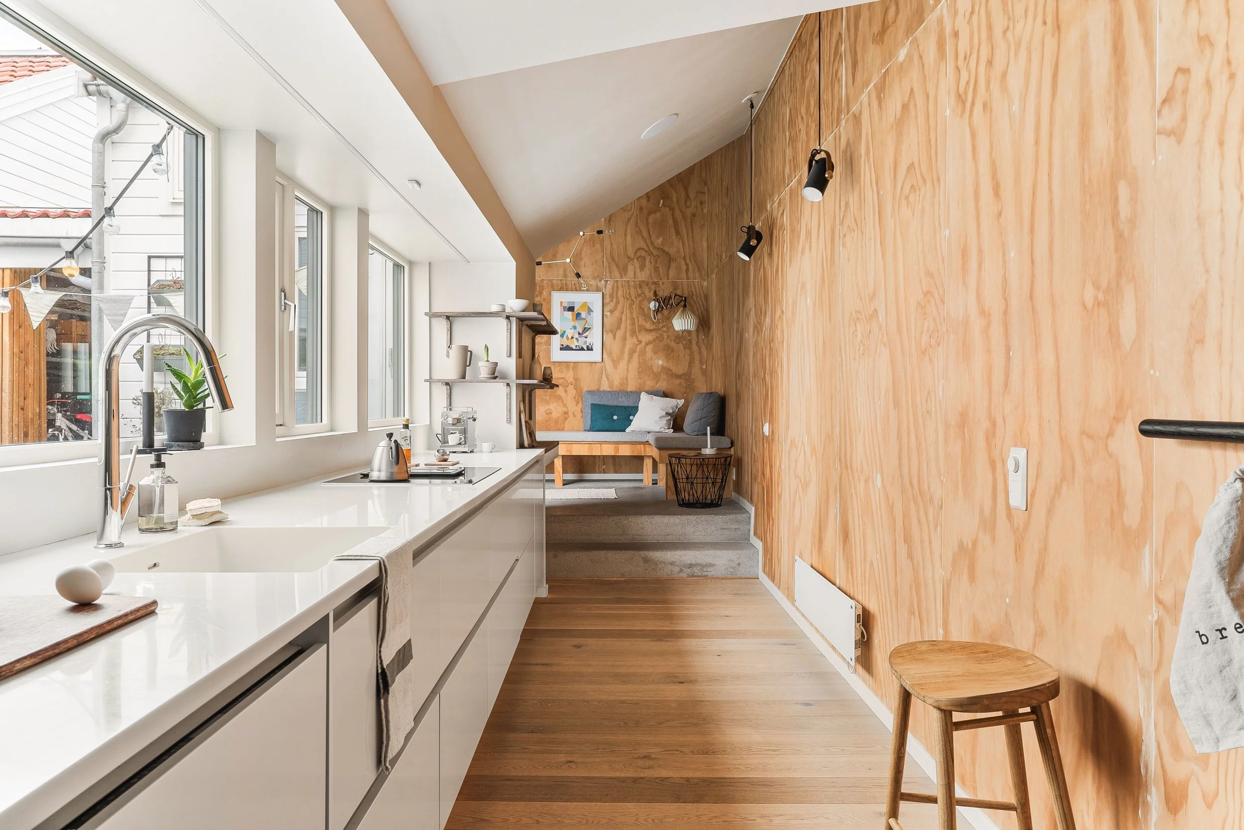 Tilbygget binder sammen et gammelt uthus med boligdelen i den tette bebyggelsen på Skansen i Bergen sentrum. Et langstrakt og lyst kjøkken maksimerer følelsen av åpenhet mot en lun bakhage, og det nye oppholdsrommet med soveplass gir huset større fleksibilitet. Prosjektet er respektfullt utformet med hensyn til den bevaringsverdige bebyggelsen.